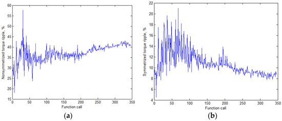 The average generator loss (Figure 9a) and the upper limit of the output current (Figure 9b) were significantly reduced through optimization. The non-symmetrized torque ripple, which is the lowest priority optimization target, according to the objective function (6), increased its value (Figure 10a). However, the noise and vibrations caused by the generator in the mechanism joining it with the wheels are determined by the symmetrized torque ripple, which was reduced (Figure 10b). A decrease in the symmetrized ripple with an increase in the non-symmetrized one indicates that the torque waveforms of individual pairs of rotor and stator stacks are in antiphase. In this way, the torque ripples of the individual SRSCs cancel each other out, as seen from Figure 11.