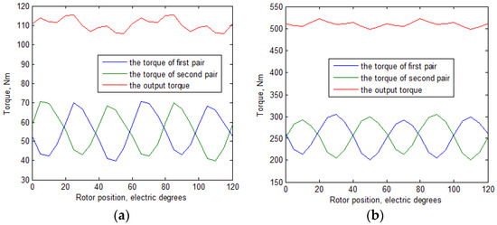 The torque created by one SRCS and the EMF induced in the armature winding of one SRCS are called nonsymmetrized. The torque and EMF of the whole machine are equal to the sum of the torque and the EMF of each SRCS. To find the torque and EMF of the whole machine, there is no need to calculate them for each SRCS. It is assumed that the torque of the second SRCS is equal to that of the first SRCS, and the EMF is equal to that of the first SRCS with a sign ‘−’ when the rotor is shifted by half the electric period [17]. Further, the torque ripple of the whole machine is referred to as symmetrized torque ripple. The torque ripple as a single SRVS is referred to as nonsymmetrized torque ripple.