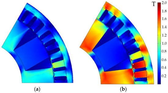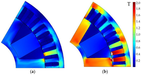 Pole-sector geometry of the generator for the optimized design. White color shows areas with flux density more than 2 T: (a) Maximum speed; (b) Maximum torque.