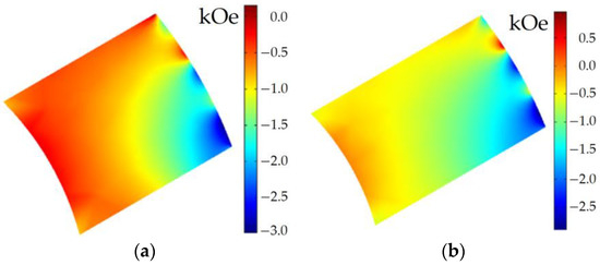 Field of the demagnetizing force (kOe) acting on the permanent magnet of the rotor at the maximum torque (at 750 rpm): (a) Before optimization, minimum value is −3.0 kOe; (b) After optimization, minimum value is −2.9 kOe.