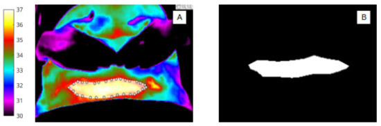 To identify pixel clusters of low temperature, shown qualitatively by the (rainbow) colour palette on the thermal image (Figure 4), automated minima regions were selected using MATLAB (by choosing continuous regions within the ROIs that are 0.5 degrees or more cooler than the surrounding areas) to produce pixel masks within the image bounding box (abdomen and wound).