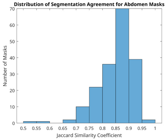 Distribution of segmentation agreement for abdomen masks between two reviewers.