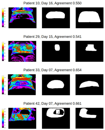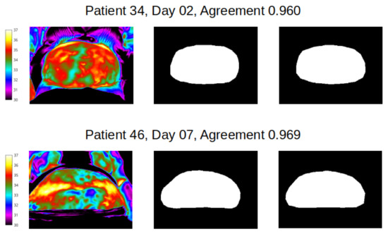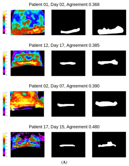 Good segmentation agreement (Jacquard similarity coefficient ≥ 0.7) of mask size and shape was observed for abdomen in all but four image label pairs (Figure 5), indicating that manual segmentation agreement of less than 70% between two observers occurred in just 1.1% of abdomen pairs only. Examples of the best agreement between reviewers in this study are shown in Figure 6 and agreement in the range of 50–70% in Figure 7. We can see from Figure 7 that the four cases of worst agreement in the segmentation of the abdomen ROI occurred mainly due to confounding factors (such as the inclusion of hands for patient 29 at day 15, disjoint temperature areas for patient 10 at day 16, and a colostomy bag in the abdomen ROI image for patient 42 at day 7).