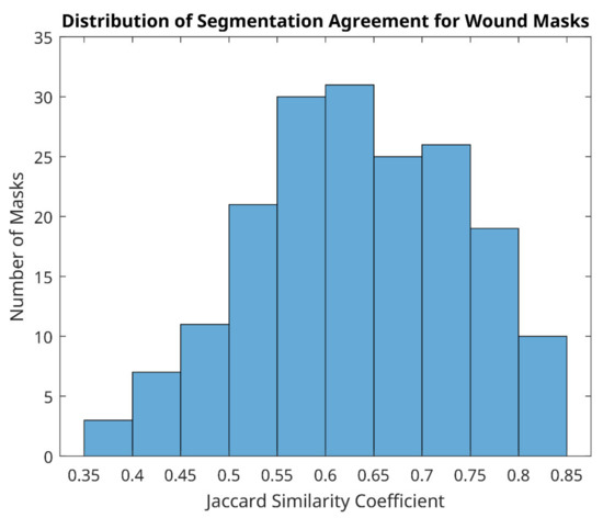 Distribution of segmentation agreement for wound masks between two reviewers.