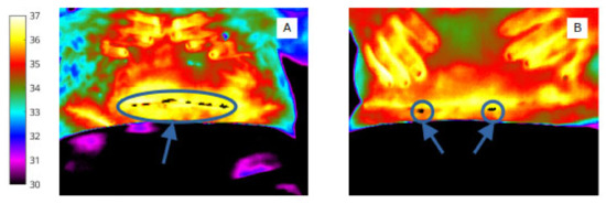 Cold spots in the wound site at day 2 of a woman who proceeded to develop SSI after caesarean section (A) and a woman with an uncomplicated wound recovery period (B).