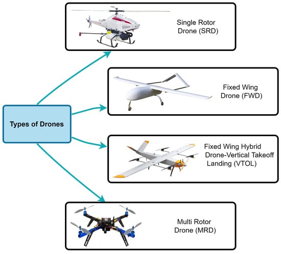 UAVs, which are also called “Drones” or “Unmanned Aircraft Systems”, are an airship that works automatically through remote controls and sensors without any human aviator, crew, or rider. There are four major types of UAVs as shown in Figure 1. Among multi-rotor drones/UAVs, the quadcopter is much more famous due to its approachability and virtuous camera command as compared to other types of drones/UAVs, it is easy to use and can work in a restricted region.