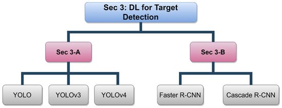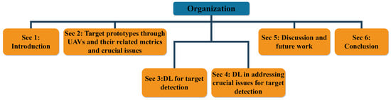 The rest of the paper is organized as follows: Section 2 narrates the concept and research tasks affiliated with UAVs classifying the area of target detection in traffic congestion along with major metrics and crucial issues. Next, Section 3 introduces DL approaches used for handling crucial issues in target detection. Section 4 inspects the existing implementation of DL techniques in target detection. Section 5 puts forward a comprehensive discussion on utilization of DL techniques in target detection and outlines the limitations to denominate future research trends. Finally, Section 6 concludes this review paper. For more clarity, the organization of the paper is presented in Figure 3.