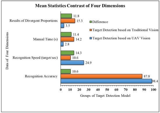 - Advantages: The aim of this approach was to compare the results of UAVs and traditional approaches on the four features: manual time, divergence results, recognition speed, and accuracy. Therein, the target detection based on the UAV approach performs better as compared to the traditional approach. This is because, in the traditional approach, the computational cost is low and poor in robustness. Furthermore, it cannot fulfill the substantial application demands in real-time detection. The comparison results of UAVs and traditional approaches based on four features are demonstrated in Figure 4.