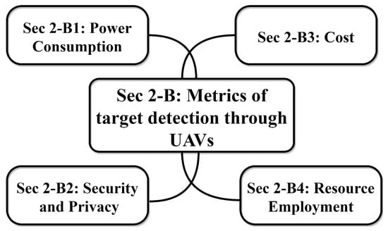 In the recent years, various researchers concentrated on the miscellaneous features of UAVs for target detection, which include cost, safety, privacy, etc. A few dominant metrics are shown in Figure 5 and reviewed below.