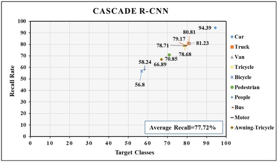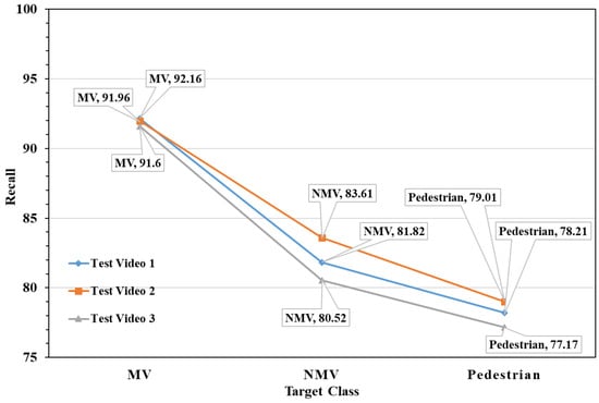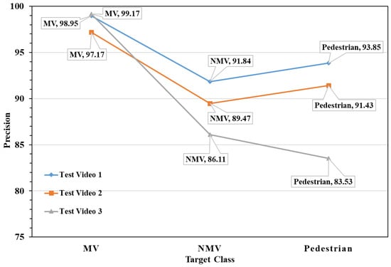 So, it is necessary to solve these limitations with some new generic algorithms in the future. In 2020, Feng et al. [75] presented a design composed of four segments: (i) vehicle detection, (ii) background registration, (iii) trajectory construction and compensation, and (iv) trajectory denoising to draw remarkably well the orbit of highway users which include pedestrian, motor vehicles (MV) and non-motor vehicles (NMV) such as bicycles, tricycles, and motorcycles and to track the small target trajectories. The YOLOv3 algorithm was applied in the first segment for detection accuracy and to get the target bounding boxes at this stage. To gain the image locomotion in the second step, the Shi–Tomasi corner attribute is utilized. This approach is an extremely popular corner detector and is extensively used due to its high correctness and fast speed for numerous real-time clarification applications and manipulated for monitoring and tracking of the target characteristics [76,77]. Trajectory construction and compensation is the third step of this design which has three main phases: (i) data correlation, (ii) trajectory classification, and (iii) trajectory compensation. The purpose of these phases is to configure the irregular vehicle trajectories formed on the basis of the perception of the speed restraint, contest the smashed trajectories, and implement the assembly tasks to rectify the omitted components. Moreover, the ensemble empirical mode decomposition approach is employed in the last step to remove noise and errors from arbitrary and unbalanced signals and enhance the trajectory reliability [78]. The exploratory outcome reveals that the presented design attains high accuracy in trajectory abstraction and detection. Figure 7 demonstrates the recall outcome of target classes in three test videos recorded by high-depiction cameras; similarly, Figure 8 represents the precision outcome of the target classes in the same test record videos.