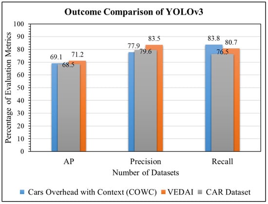 Figure 9. Result of YOLOv3 approach on different datasets. - One-Stage Detectors for Complex background: In [65], Feng et al. presented a gradient classification prophecy branch in the head network of YOLO to produce angular data and utilize the circular rectify class to overcome gradient classification loss and detect the target under complex circumstances. Moreover, to improve the UAV images, they implemented the data augmentation approach which consists of rotation, arbitrary flip, translation, and HSV augmentation. Then, they presented the cross-stage partial bottleneck transformer (CSP BoT) segment which is a hybrid approach that uses the multi-head self-attention process convolutions to encapsulate the latent broad spatial correlation of the target in the UAV images and improve the critical information. Finally, they adopted the general characteristics at various resolutions and predicted the spatial disparity in ambiguity by the weighted cross-scale interconnection. The adaptive spatial feature fusion-Head block was presented. The enormous experimental outcomes on UACS-AOD and UAV-ROD datasets show the presented model’s dominance, low design complexity, and cost-effectiveness.