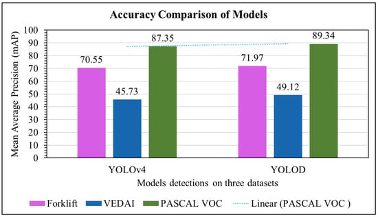 Figure 10. Average precision of YOLOv4_Drone approach based on different target classes.In 2022, Luo et al. [68] presented a YOLO-DRONE (YOLOD) model of UAV images which were upgraded on the foundation of YOLOv4 to handle the small-size objects and clustered background. To decrease the complexity of the model and obtain the best detection consequences, different activation functions were used as a backbone which comprise of Mish [83] and HardSwish [84] activation functions. To enhance the location consequences, they stimulated the convergence, and summed up the loss of the bounding box regression EIOU loss function [85]. Moreover, they utilized the pyramid pooling module in the replacement of the SPP segment and compared the model with the YOLOv4 algorithm. The aim of using the pyramid pooling module is to enhance the receptive field and performance of the detection model [86]. To boost the multi-scale feature fusion and detect the targets on various scales at the end of the model, an adaptive spatial feature fusion segment was introduced [87]. The testing was done with the help of three different datasets which included forklift, VEDAI, and PASCAL VOC datasets, where the forklift is the first known dataset deployed on UAV images. During the investigation, it was observed that the presented YOLOD model achieves higher accuracy on all datasets and is good enough for complex backgrounds and small targets as compared to YOLOv4, as shown in Figure 11. However, it is still necessary to boost the performance of the model when the number of images is expanded.