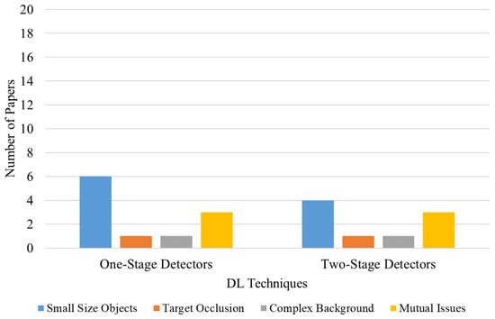 Furthermore, different object detection approaches have been presented based on CNN, for instance, Region-based Convolutional Neural Network (RCNN) and Single Shot MultiBox Detector (SSD) to perceive the small targets and perform at low elevations. However, their performances are still not good enough in target detection in terms of accuracy [18,19,20]. In contrast, for better performance, the single-stage detector techniques such as YOLO v3 and YOLO v4 were presented by Redmon and Boboc [21] and Alexey et al. [22], which are better in target detection and permit excellent real-time achievement and high precision. But it prerequisites a notable computational scheme. Besides this, in [21,23,24], UAV-based detection and tracking methods have been presented, which merge the illusion, KCF (kernel correlation filter) based detectors, and YOLOv3. Moreover, many review books and articles have been found to detect targets in traffic congestion. For example, Butilă [25] presented a review on the applications of UAVs associated with traffic attention. Srivastava et al. [26] studied important parameters to foreground the small-size issues. Osco et al. [27] reviewed both UAV remote sensing images and DL in a review paper. Alzahrani et al. [28] studied a review based on an extant UAV-assisted system. Kanistras et al. [29] monitored the traffic based on the UAV system, while Outay et al. [30] reviewed the vision processing techniques. Park et al. [31] reviewed the information and communication technology approaches based on DL application to analyze the target in traffic in real-time using UAVs. Zhang et al. [32] presented correlation filtering and other tracking algorithms to solve the target occlusion problem in a review paper. From the above body of work, it is worth noting that all the above-mentioned works consider either only UAV-based target detection or one specific kind of DL for target detection. None of the above-mentioned reviews considered applications of DL and UAVs in target detection at the same time. The purpose of this review paper is to discuss different issues rather than one specific issue using different methods in contrast to other review papers and provide the future direction related to more preferable methods to handle those issues in the upcoming years. It also presents a brief overview of DL-based approaches for UAV-based target detection.