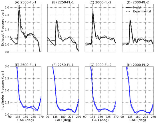 Comparison between experimental and 1D modeling results: CAD vs. (A–D) Exhaust pressure; (E–H) In-cylinder pressure.