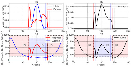 (A): Mass flow rate at intake and exhaust pipes, (B): Average mass flow rate, (C): Convective heat transfer for proposed and Woschni models, (D): Actual convective heat transfer of overall cycle.