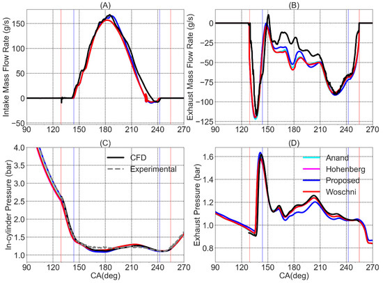 The information in Figure 4 shows that the fluid behavior for all heat transfer correlations, compared to CFD, is similar. These include the peaks and trends in the intake mass flow rate-Figure 4A, exhaust mass flow rate-Figure 4B, pressure in the cylinder-Figure 4C, and pressure in the exhaust manifold-Figure 4D during the scavenging process. At the same time, comparing results with the 1D model, Figure 4C not only shows the information of the 1D model to CFD comparison but also provides the information with experimental in-cylinder pressure traces. This validates the 1D model compared to experimental results and the CFD simulation predictability of experimental results.
