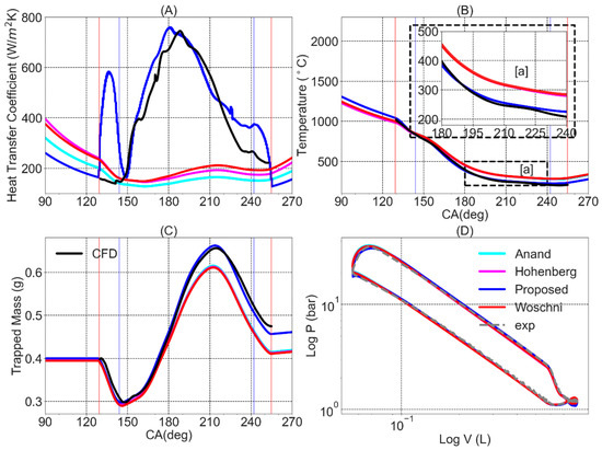 Figure 5A provides information on the heat transfer coefficient used in this study during the scavenging process. A solid black line depicting the instantaneous heat transfer coefficient from CFD simulation is depicted in Figure 5A. It can be seen from Figure 5A that the methodology followed in developing the proposed heat transfer provides similar peaks and follows trends as in CFD simulations during scavenging. On the other hand, the state-of-the-art heat transfer correlations fail to provide the necessary heat transfer coefficient during the same process. Figure 5B provides the information with temperature traces achieved due to the adjusted heat transfer coefficient. Figure 5C depicts the information on the trapped mass inside the cylinder during scavenging. Figure 5B,C show CFD results plotted with a solid black line, showing the temperature and trapped mass, respectively, which are the same as in the 1D model at the opening of the exhaust ports. Figure 5D provides information (in logarithmic scales) related to evolution inside the combustion chamber for the 1D model and experimental data. Figure 5D results justify that the combustion settings used in the modeling stage provide accurate results. Observing the trends and patterns from Figure 4 and Figure 5, it can be justified that comparing different heat transfer models is viable as all models have similar behavior.