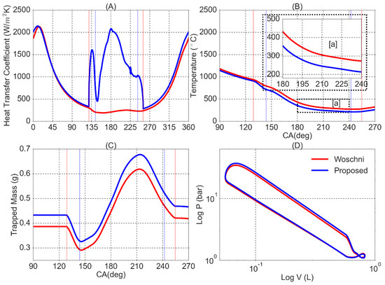 Results comparing Woschni and proposed heat transfer model for (A): Heat transfer coefficient-1D model (B): In-cylinder temperature evolution during scavenging, (C): In-cylinder trapped mass, (D): logarithm pressure vs. Volume evolution.