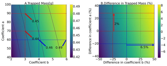 In this analysis, 35 points are studied, with values for coefficient b ranging from 2–6 and coefficient a ranging from 40–100. Figure 7A provides the information on the effect on trapped mass in absolute terms, while Figure 7B, depicts the information on the differences in trapped mass with variations in percentage in coefficients a and b from the mean values. For this calculation, Equation (21) is used: