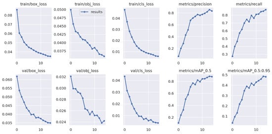 The different loss functions and evaluation metrics for the training of the YOLOv5s can be seen in Figure 7. The curves in the figure illustrate three distinct forms of loss functions: box loss, object loss, and classification loss. The predictive bounding box coverage of the target object is measured in terms of box loss. Essentially, abjectness measures how likely it is that a specific object will be found in a particular region of interest. High objectivity shows whether an object is present in a certain image window. The discrepancy between a prediction box object’s actual class and the anticipated class is known as classification loss. It is evident from the figure that the model’s performance gets better over every epoch. Moreover, we can see that precision and recall for both training and testing keep increasing, which suggests that the model is not over-fitting. Furthermore, we can see that near the 15 epochs, the model training and testing loss are converging.