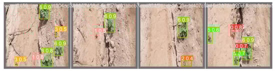 Prediction of the model on a test dataset can be seen in Figure 8. Prediction boxes represent each of the three crop types and four weed species, and the network’s final output includes the probability of each category’s inclusion as well as their locations.