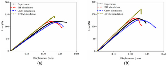 The load-displacement curves predicted by the three numerical methods expressed different shapes even though the simulated object was the same FE model, as shown in Figure 4. The elastic stage in the curves from the EIF and XFEM simulations nearly coincided, and the apparent stiffness in the elastic stage from the CDM simulation curves gradually decreased. The CDM simulation curves showed a brief yielding phase after the elastic stage, followed by the apparent failure, whereas the EIF and XFEM simulation curves went straight from the elastic stage to the failure stage.
