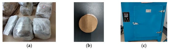 Figure 1 shows the density tests of the soil mass before compaction. The original soil samples (Figure 1a) were made into the standard specimens using a cutting ring (Figure 1b), and their wet density was measured by weighing on a scale. Then, after drying in a dry oven for 24 h (Figure 1c), the dry loess specimens were obtained [18]. Finally, through measurement and calculation, the dry density and the moisture content of the loess specimens before compaction were obtained. Table 1 lists various material parameters of the soil mass before compaction.