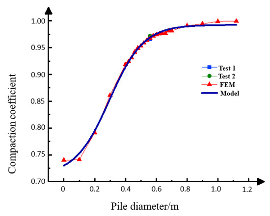 As shown in Figure 6, the results of Equation (2) are consistent with the test and numerical results. When the pile diameter D equals zero, that is, there is actually no pile penetration, the soil compaction coefficient should theoretically be the compaction coefficient of undisturbed soil, that is, 0.74. By Equation (2), the model result of the soil compaction coefficient corresponding to zero pile diameter is also 0.74. On the other hand, when the pile diameter D tends to infinity, the soil compaction coefficient should theoretically be 1. The model value of the soil compaction coefficient corresponding to an infinite pile diameter derived from Equation (2) is also 1.
