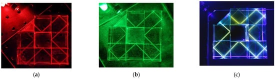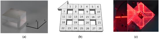 The prism resonator tiling was precisely positioned on a flat platform, 200 × 200 mm2 in size. A rectangular triangular prism was used as a coupler to lead the light beam into and out of the quartz glass at the angle of total internal reflection. The angle of total internal reflection is 44.37° according to Snell’s law. The resonators were fixed on an adhesive composition of a mixture of vinyl acetate (30%) and acetone (70%) copolymers. The immersion liquid was an aqueous solution of glycerin with a density of 1.228 g per cubic centimeter. The refractive index of the immersion liquid was 1.45. No more than 0.01 mL of immersion liquid covered each face to avoid a meniscus on adjacent vertical faces, producing scattering and deviation of the beam. Before applying the immersion liquid, each prism was cleaned of dust and stains using crepe paper impregnated with a solution of water (80%), isopropanol (10%), metaxypropanol (5%), and nonionic surfactant (5%). Then, rectangular quartz prisms were connected, strictly in the order of numbering, as denoted in Figure 1b. After connecting each new segment, the operability of the tiling was checked using violet (405 nm) and red (650 nm) lasers (Figure 1c). Each prism was adjusted according to three degrees of freedom, namely one rotation and two translations along the axes X and Y (Figure 1a). The glass platform with assembled tiling and a triangular coupler was fixed on an optical bench next to the laser source.