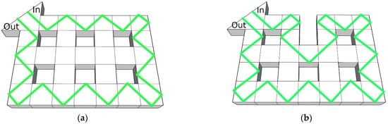 Figure 2 schematically demonstrates the stability of the beam trajectory; resonator #3, as denoted in Figure 1b, was removed in order to experimentally create the lattice defect of the TPhTI. Here, the green color indicates the trajectory of the beam. In and Out denote the entry and exit points of the beam, respectively. The input and output can be swapped; this does not affect the beam trajectory in any way. In the considered case, when removing nine resonators (#8–#9, #12–#16 and #19–#20), we observe an ordinary waveguide. However, while preserving the structure, we can observe robust beam trajectory relative to the removal of resonator #3 from the TPhTI. In this case, resonators #8, #9, and #13–15 are used to compensate for the absence of resonator #3. Obviously, all nine internal resonators have the same purpose with respect to other restructurings. For example, the removal of resonator #22 is compensated for by resonators #12, #13, and #19. This is the main topological insulator feature; an ordinary waveguide lacks this feature and behaves unstably with respect to the mentioned restructurings.