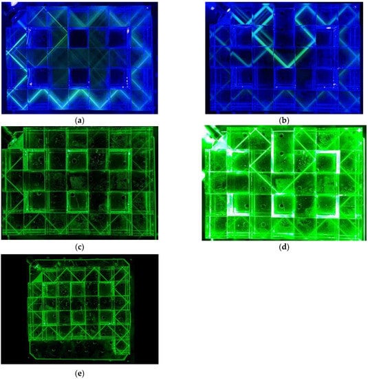 Figure 3 shows that the laser beam bypasses the defect and exits the triangular coupler. The beam trajectory passes along the surface of the TPhTI structure due to the effect of total internal reflection on the faces of the prism resonators and exits back, as evidenced by the bright spot in the upper left corner of Figure 3b. The propagating state persists against removing (Figure 3b,d) or attaching new prism resonators (Figure 3e).