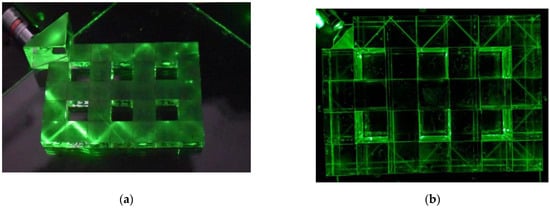 Figure 4 shows that the presence of a topological state does not depend on prism resonator size. To demonstrate this scalability, the rectangular prism resonators were made in two versions. The first set was manufactured from quartz glass with a refractive index of 1.43, with linear dimensions 12 × 12 × 8 mm3 (Figure 4a). Their linear dimensions were ensured by the Maksutov method [] with 10 um accuracy. The second set was manufactured from Chinese crown glass K9 with a refractive index of 1.517 and linear dimensions 30 × 30 × 30 mm3, with 30 um accuracy (Figure 4b).