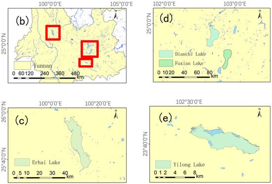 The distribution of the lakes in this study in Yunnan Province, China. (a) Distribution map of rivers and lakes in China. The red box indicates Yunnan Province, where the study area is located. (b) Distribution map of rivers and lakes in Yunnan Province. Red boxes indicate the four lakes investigated in this study. (c) Geographical location of Erhai Lake. (d) Geographical location of Dianchi Lake and Fuxian Lake. (e) Geographical location of Yilong Lake.