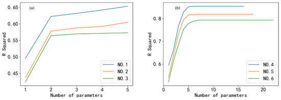 The number of final parameters and the prediction accuracy of each stepwise regression model (Table 3 experiment number NO.1-6) are shown in Supplementary Materials Table S1. The results showed (Figure 2) that the R-squared of the models increased with the number of parameters added to the model formula. However, after the number of parameters reached a certain level, increasing the parameters of the model no longer significantly improved the R-squared value of the model, which implied that convergence was achieved. By comparing the R-squared of the models with the simultaneous window training dataset (Figure 2a,b: lines with the same color), it was clear that the group of spectral variables using the bands and band ratio combination had a higher R-squared, that is, the spectral variables using the bands and band ratio combination can better explain the relationship between remote-sensing reflectance and lake SD. Moreover, as shown in Figure 2, the model with the 1-day time window training dataset performed better than the model with a longer time window training dataset, and the R-squared value decreased as the time window of the training set increased. Table 4 shows the optimal solutions of the two groups of models with different spectral variables, and the R-squared of spectral variable group 2 was significantly higher than that of spectral variable group 1.