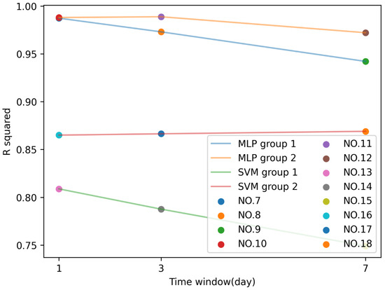 The relationship between the time window and the model R-squared of the MLP and SVM models. The experiment number corresponds to Table 3. The blue line represents the MLP model using spectral variable group 1. The orange line represents the MLP model using spectral variable group 2. The green line represents the SVM model using spectral variable group 1. The pink line represents the SVM model using spectral variable group 2. Group 1 represents the spectral variables that use a single band or band combination. Group 2 represents the spectral variables that use a band combination and band ratio arrangement.