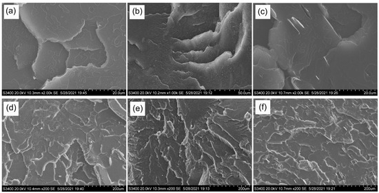 The predominant orientation of the layered filler is worth noting (see Figure 1c,f. Filling the PS matrix with spherical (fullerenes) or filamentous anisometric (nanotubes) particles led to the formation of an isotropic structure of the composite, while two-dimensional particles had a preferential orientation caused by the extrusion process. Therefore, the most efficient dispersed filler can be selected depending on the expected type of loading; for example, filamentous structures are preferable for uniaxial loading, while the layered filler is favorable at loading perpendicular to the longitudinal axis in the cross-sectional plane.