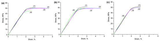 Stress–strain curves of composite samples with carbon nanofillers: PS + fullerenes (a), PS + CNT (b) and PS + graphene (c). Curves (1)–(4) correspond to filler concentrations of 0, 0.1, 0.5, and 5 wt%, respectively.