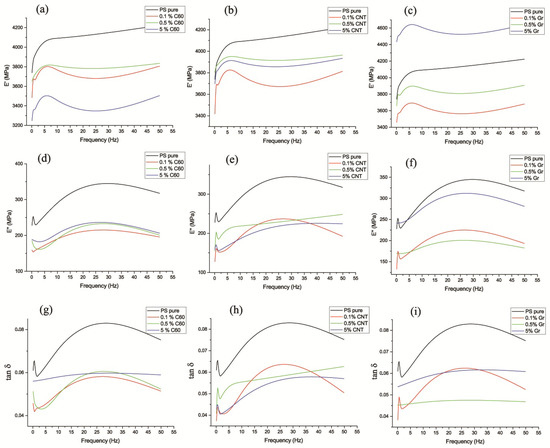 Frequency dependencies of the elastic modulus (a–c), loss modulus (d–f) and mechanical loss tangent (g–i) of PS-based composites filled with fullerenes C60 (a,d,g), carbon nanotubes CNT (b,e,h) and graphene Gr (c,f,i), obtained by DMA.