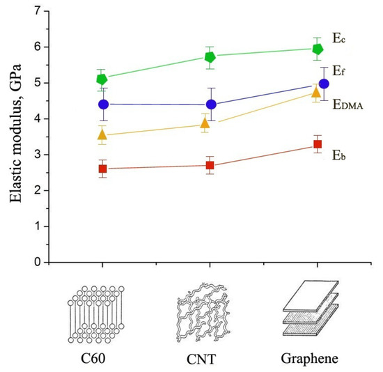Figure 6 presents a graphical summary of the values of elastic moduli of PS-based composites filled with dispersed particles of carbon allotropes obtained in mechanical tests utilized. The comparison was made for samples containing 5 wt% of each type of carbon particle. DMA data are shown for the frequency of 5 Hz. As can be seen from Figure 6, spherical nanoparticles (fullerenes) provided a considerable difference in all elastic moduli obtained at static, dynamic, and ultrasonic tests. With anisometric particles (nanotubes) the difference in moduli obtained in three-point bending tests under static and dynamic loads decreased, and with the layered filler (graphene) it was practically absent. However, for both CNT and Gr, a considerable difference was still observed between the moduli determined in tensile and three-point bending tests and ultrasonic measurements. In general, elastic moduli obtained by nondestructive (ultrasonic) measurements showed higher values than those at tensile or three-point bending tests. Composites filled with graphene were characterized by higher elastic moduli of all types as compared to composites with other carbon nanoparticles. This finding correlates with the results by Kim et al. [55], who showed that mechanical reinforcement with graphene was superior to that with carbon black or single-wall nanotubes. We note that as shown in our recent paper [34] and by other researchers [56,57] hybrid nanofillers containing two carbon allotropes of different shapes can provide a synergistic effect and allow for obtaining better reinforcement of the material. Such fillers can form interconnected structures, improving the dispersion of filler particles and changing the crystallinity of the polymer matrix.