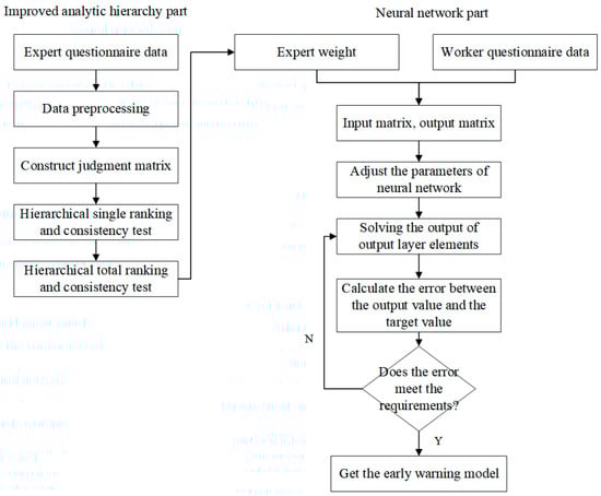 To fully consider the opinions of both experts and workers, we first collected expert opinions through a questionnaire survey and utilized an improved AHP method to determine the weight of each factor. Subsequently, we collected the opinions of workers through questionnaires and accordingly assigned them weights. The BackPropagation neural network was then employed to establish the prewarning model. The weight correction value could reflect the common opinions of experts and workers at this time. Therefore, the factor weight could be analyzed, and the model could be used for the safety assessment and early warning of individual workers. The specific research route is shown in Figure 1.