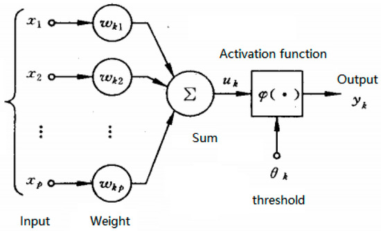 A basic neuron model is shown in Figure 2, which generally contains the following basic elements: a set of connections where the connection strength is represented by the weight of each connection. A positive weight indicates activation, whereas a negative weight indicates inhibition. A summation unit is used to obtain a weighted sum (linear combination) of the input signals. A non-linear activation function acts as non-linear mapping and limits the neuron output amplitude to a certain range, also known as a threshold. The above basic elements can be expressed by Formula (6).