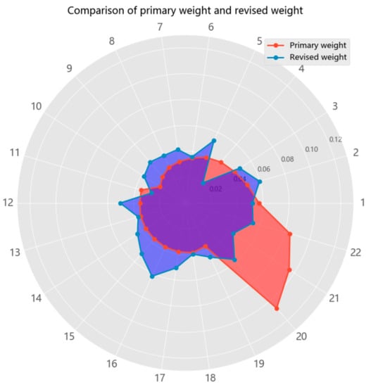 The serial numbers corresponding to each factor are defined, as shown in Table 14. The comparison of the primary weight and the revised weight is shown in Figure 5.