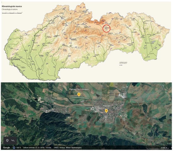 The location of the meteorological station in Slovakia (upper); in Poprad (lower). Source: [,].