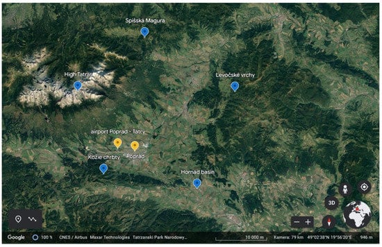 - Google Earth. Available online: https://earth.google.com/web/search/Poprad,+Slovakia/@49.05877989,20.29744794,672.117089a,24378.01462403d,35y,0h,0t,0r/data=CnsaURJLCiUweDQ3M2UzYTk0YmNmZGExOTE6MHg5Mzk3NGEwYWVmODZiOTIwGSrNQSuLhkhAIdHHfECgSzRAKhBQb3ByYWQsIFNsb3Zha2lhGAIgASImCiQJI8yHUE9QNUARIcyHUE9QNcAZKLUxbvu7QkAhhILfAjV3UMA (accessed on 8 March 2023).