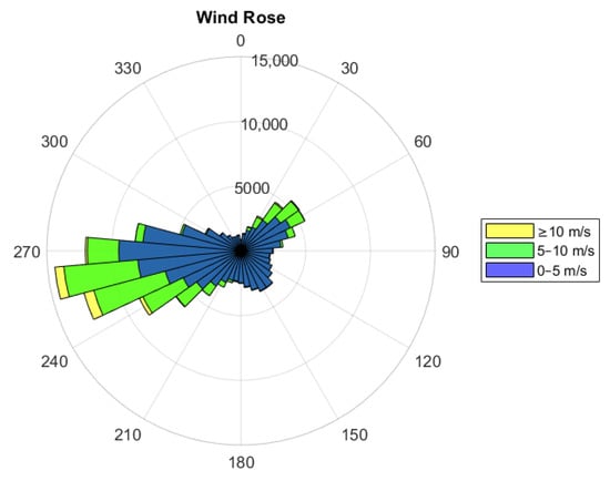 Usually, a 30-year period is considered necessary to estimate the long-term wind conditions at a certain location, but a period of at least 10 years may be sufficient to obtain an acceptable estimate []. The data used in this study were collected over a 17-year period (2005–2021) and counted a total of 148,001 wind speed measured data. Throughout the quality check, errors and missing data were removed from the analysis. After the check, the percentage of data removed was very low—0.68%; this indicates a high reliability of the monitoring system.