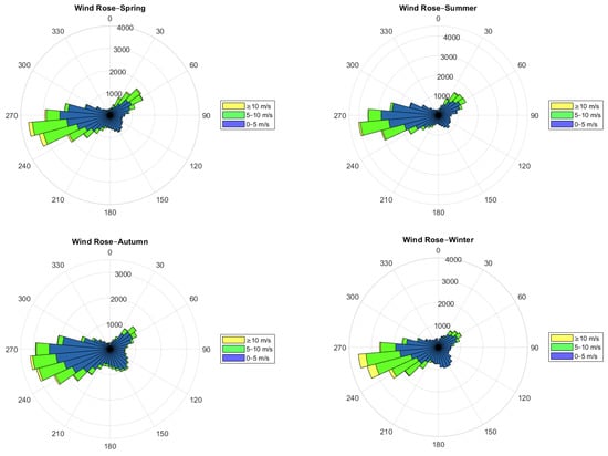 Based on the available wind data, the wind directions were analysed. The wind rose diagrams show the temporal distribution of the wind direction at a given location. Here, the common form of the wind rose diagram was used, consisting of 36 evenly spaced sectors that were prepared using []. The wind rose was drawn for each season and for the whole studied period 2005–2021, as shown in Figure 3 and Figure 4.