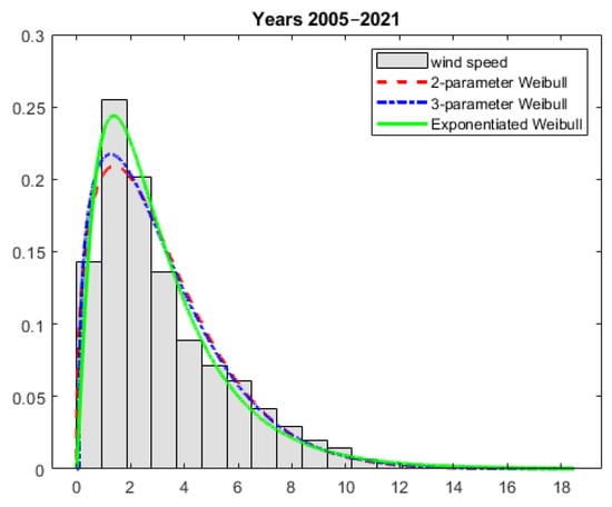 Modelled probability distributions fitted to the histogram of the wind speed data–the entire considered period.