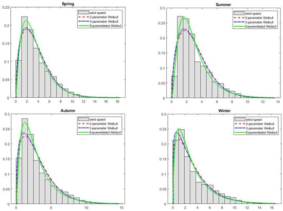Modelled probability distributions fitted to the histogram of the wind speed data—the seasons.