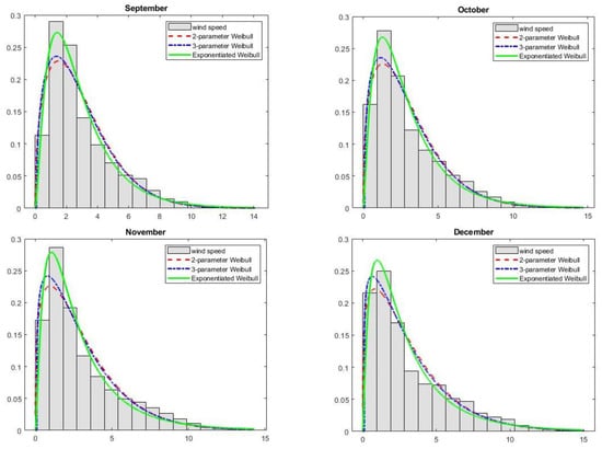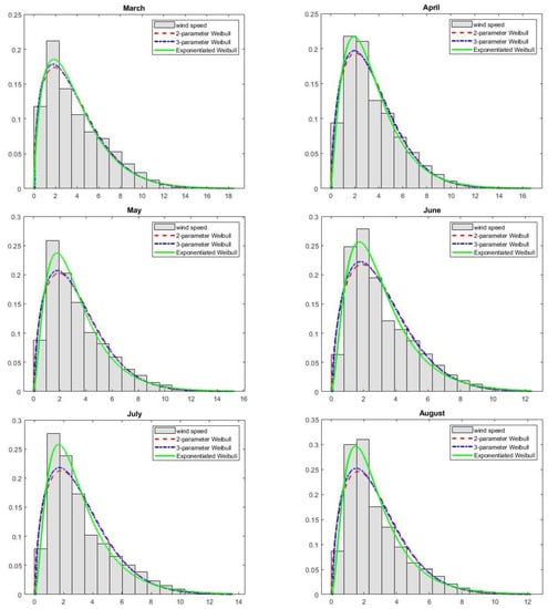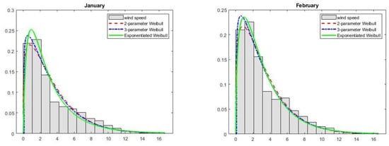 Modelled probability distributions fitted to the histogram of the wind speed data—the respective months.