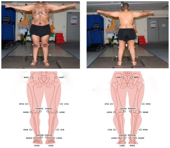 Marker placement (upper) according to Vicon® Plug-in-Gait Model (lower). Note: Subject with markers: front view (left) and back view (right); the shoulder and trunk markers used for balance analysis.